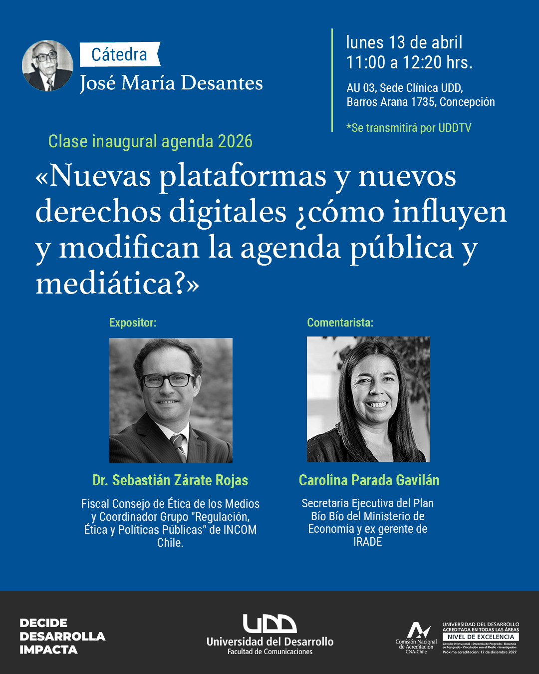 Charla inaugural de la Agenda 2026 de la Cátedra Desantes, donde se abordará la influencia que están teniendo las plataformas digitales y la configuración de nuevos derechos que surgen en ese ámbito en la definición y gestión de la agenda pública y la agenda mediática.